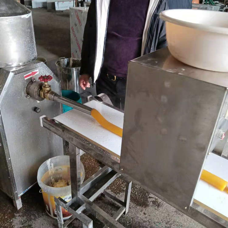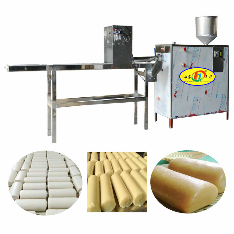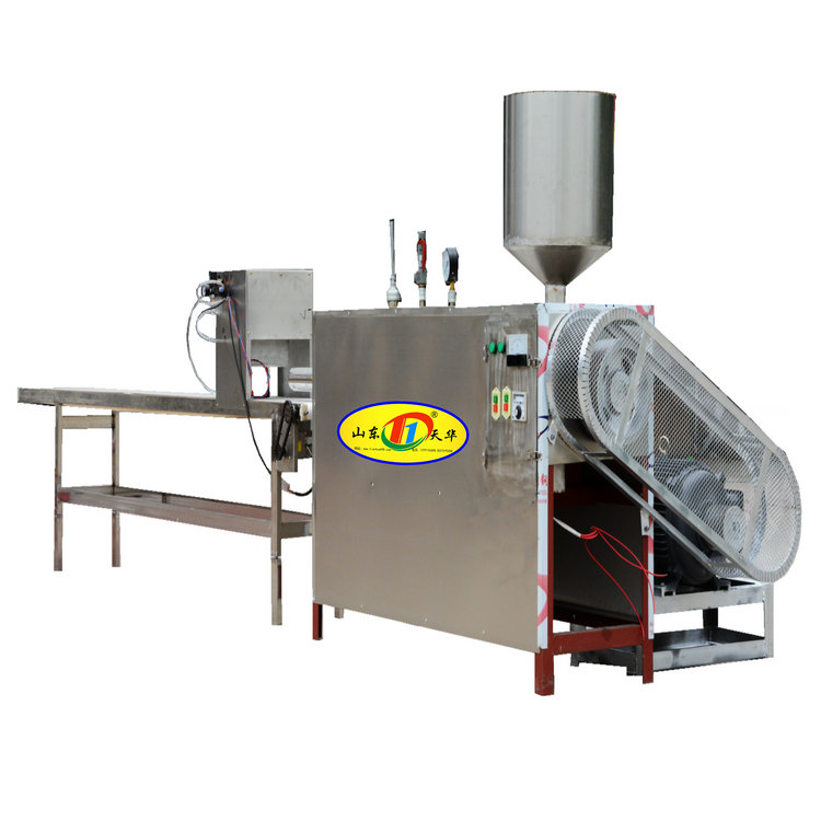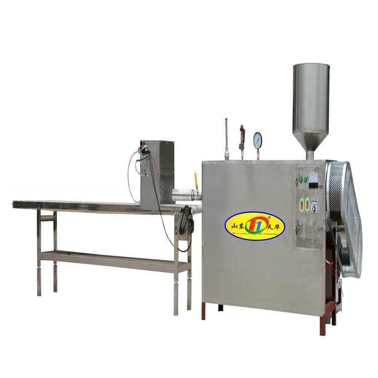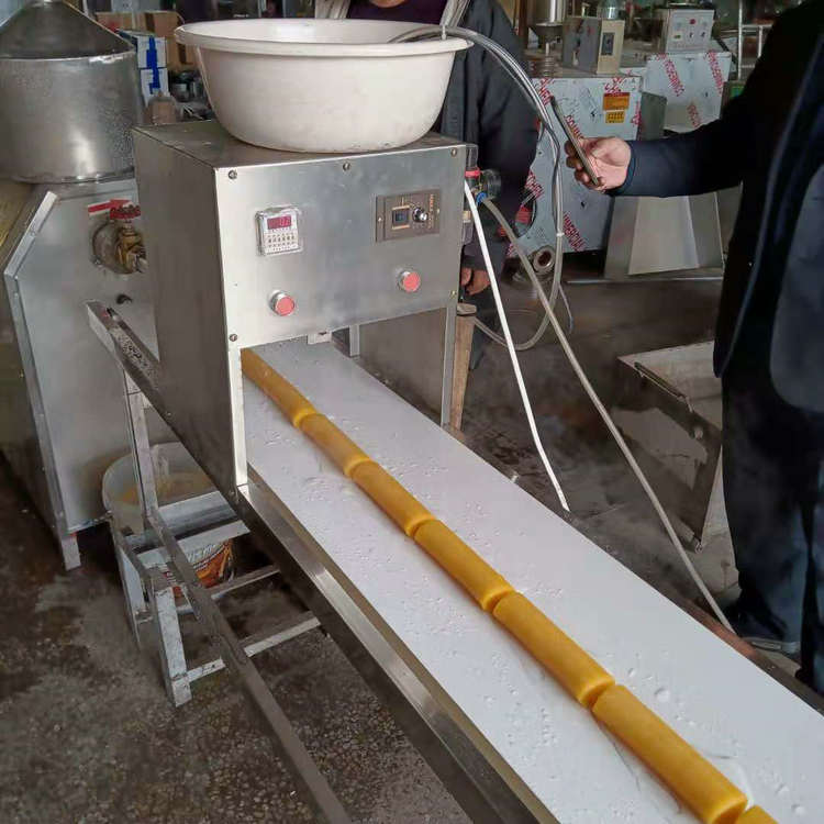 玉米粑粑机由电热温控装置、水浴蒸箱、螺杆揉压匀质挤出装置、成型模头和数控切断机组成,螺杆揉压匀质挤出装置外面由水浴蒸箱包围,蒸箱内注有水,通过电热温控把水烧开,蒸煮通过螺杆的玉米浆,使之熟化,并推揉匀质,经模具定型挤出而成。其配套的切断机可以通过延时控制器调整切断的长短。该机也可以用米浆加工年糕、米豆腐、碱粑等,还可以用木薯淀粉和玉米淀粉加工虾片等。